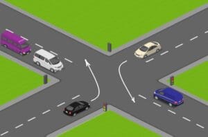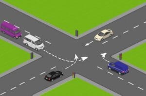 Otse ja parem pööret sooritav sõiduk lase läbi ja siis lõpeta pööre! Jälgi ka pöörde lõpus olevaid jalakäijaid juhul kui on neid!